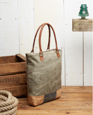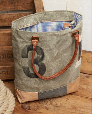 Bolso realizado con telas reciclada. Asas en piel e interior con tela de rayas y bolsillo. Cierre con cremallera.