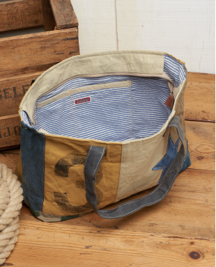Bolso realizado con telas recicladas, vaquera y nueva. Estampación e interior de tela de rayas blancas y azules. Lleva cremallera.