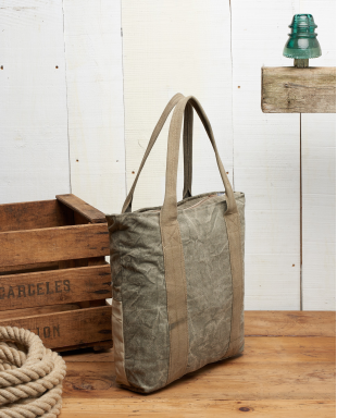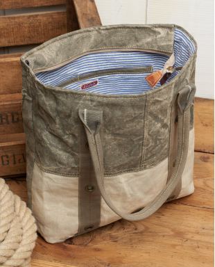 Bolso realizado con tela militar reciclada y nueva. Aplicaciones en metal. Interior de rayas blancas y azules. lleva bolsillo interior.