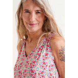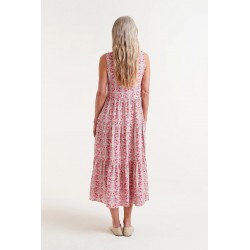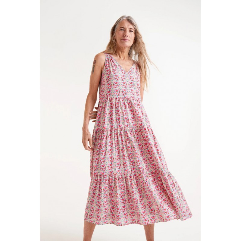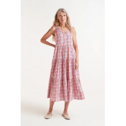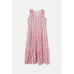 Vestido midi fluido en crepe ligero con estampado Sugar. Con escote pico sin magas. Modelo entallado en la cintura con detalle de cortes horizontales.