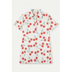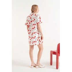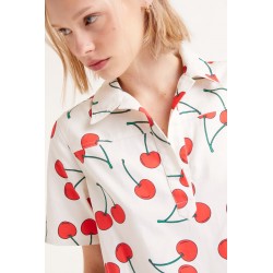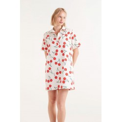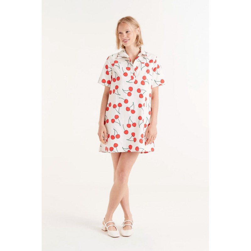 Vestido corto en twill de algodón con estampado de cerezas. Con cuello solapa y manga corta. Modelo de corte recto.