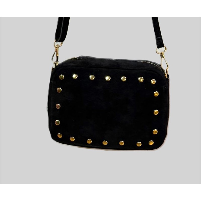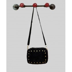 Bolso negro serraje con tachuelas doradas. Dos compartimentos con cierre cremallera