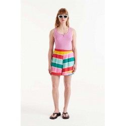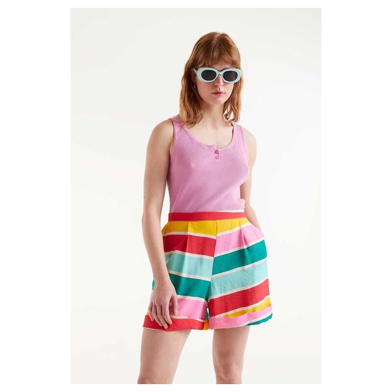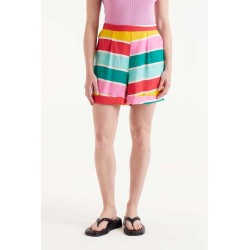 Pantalón corto en crepe ligero con estampado de rayas Colour Wave. Con cintura fija frontal y elástica trasera de tiro medio. Bolsillos laterales. Detalle de bajo con vuelta.